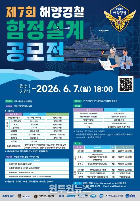 해양경찰청 이원재 장비기술국장은 “이번 공모전은 정부의 해양안전 강화 및 첨단기술 기반 정책 방향에 발맞추어 미래 조선·해양 설계 역량을 갖춘 인재를 양성하기 위한 것”이라며 “현장성과 창의성을 겸비한 다양한 아이디어가 발굴되길 기대한다”고 밝혔다.