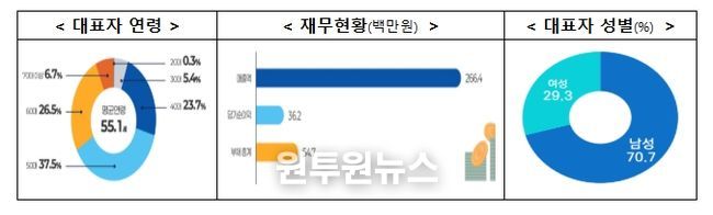 대표자 연령은 평균 55.1세, 성별은 남성 70.7%, 여성 29.3%로 조사됐으며, 기업당 평균 매출액은 266.4백만원, 당기순이익은 36.2백만원으로 나타났다.