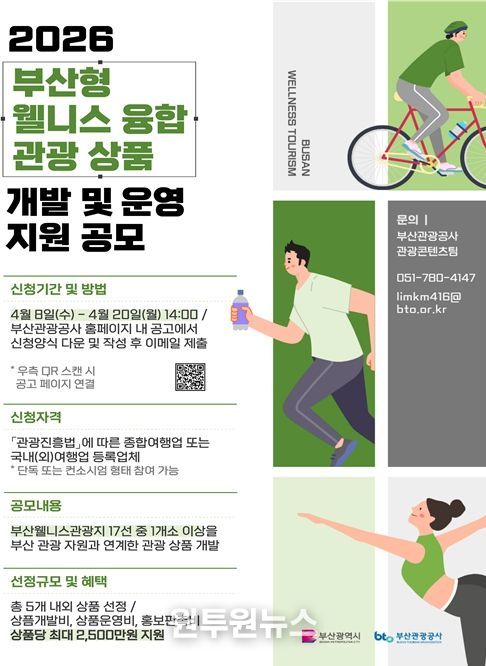(원투원뉴스) 부산시와 부산관광공사는 부산 웰니스 관광자원을 활용한 융합 관광상품 개발과 글로벌 시장 진출을 지원하기 위해 '부산형 웰니스 융합 관광상품 개발 및 운영 지원' 공모를 오는 4월 20일까지 실시한다고 밝혔다.
