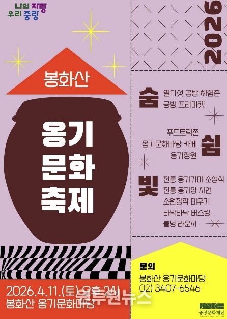 (원투원뉴스) 중랑구가 4월 11일 오후 2시, 신내동 봉화산 옹기문화마당에서 서울시 유일의 전통 가마를 활용한 ‘2026 봉화산 옹기문화축제’를 개최한다. 이번 축제는 작년에 개관한 ‘봉화산 옹기문화마당’의 운영과 전통 옹기가마 가동을 기념해 마련됐다.