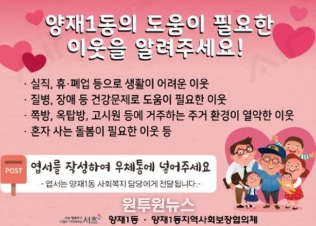 (원투원뉴스) 서울 서초구가 복지 사각지대에 놓인 위기가구를 조기에 발굴하고 지역사회 중심의 촘촘한 보호체계를 구축하기 위해 양재1동주민센터와 양재 민원분소 앞에 희망우체통 ‘함께함’을 설치하고 본격 운영에 나섰다.