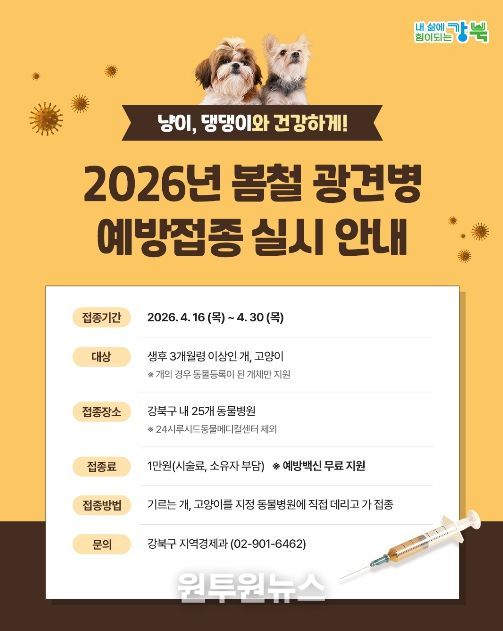 (원투원뉴스) 서울 강북구는 반려동물과 구민의 건강을 보호하기 위해 4월 16일부터 30일까지 ‘2026년 봄철 광견병 예방접종’을 실시한다고 밝혔다.