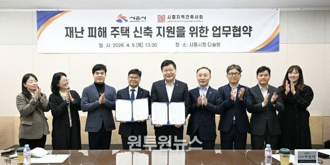 (원투원뉴스) 시흥시는 각종 사회재난 및 자연재난으로 피해를 본 주민의 신속한 주거 안정을 지원하기 위해 시흥지역 건축사회와 ‘재난 피해주택 신축 지원을 위한 업무협약’을 지난 4월 9일 다슬방에서 체결했다.