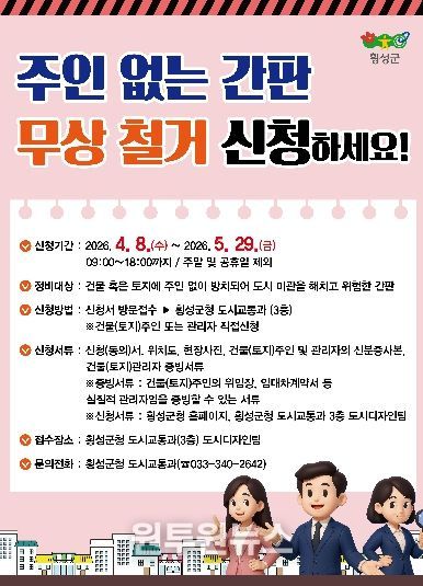 (원투원뉴스) 횡성군이 건물이나 토지에 주인 없이 방치된 간판의 무상 철거를 지원하는 '2026년 주인 없는 간판 정비사업'을 추진한다고 10일 밝혔다.