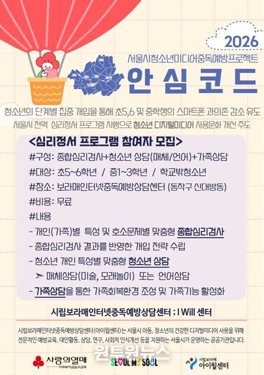 안심코드 프로그램은 올해 서울시 거주 초등학생 5~6학년 및 중학생 1~3학년, 학교 밖 청소년을 대상으로 무료 진행 중이며, 자세한 문의 및 신청은 시립보라매인터넷중독예방상담센터에서 할 수 있다.