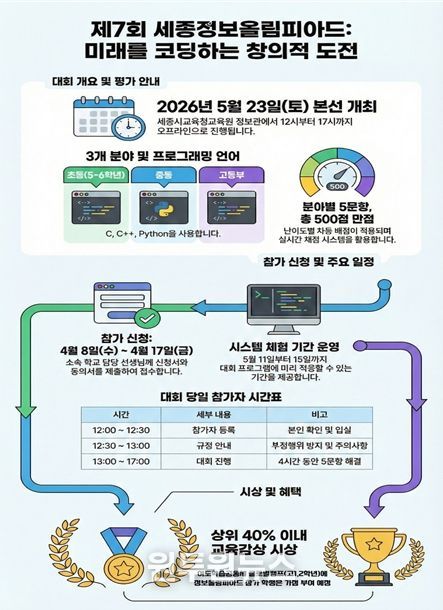 (원투원뉴스) 세종특별자치시교육청은 학생들의 논리적 사고력과 창의적 문제해결력을 함양하기 위해 ‘제7회 세종정보올림피아드 대회’를 개최한다.
