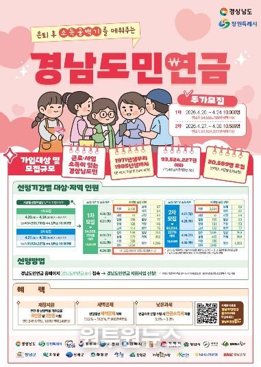 황선복 창원시 인구정책담당관은 “이번 경남도민연금 추가모집은 차수별 인원이 배정되어 있으므로 사전에 모집일정, 본인의 소득구간, 제출서류 등 모집공고를 정확히 확인하시길 바란다”고 요청하며, “시민들의 적극적인 참여를 통해 안정적인 미래를 준비하시길 바란다”고 밝혔다.