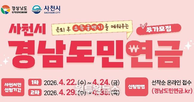 (원투원뉴스) 사천시가 은퇴 후 소득 공백기를 대비하기 위한 ‘2026년 경남도민연금 지원사업’ 가입자를 추가 모집한다고 10일 밝혔다.