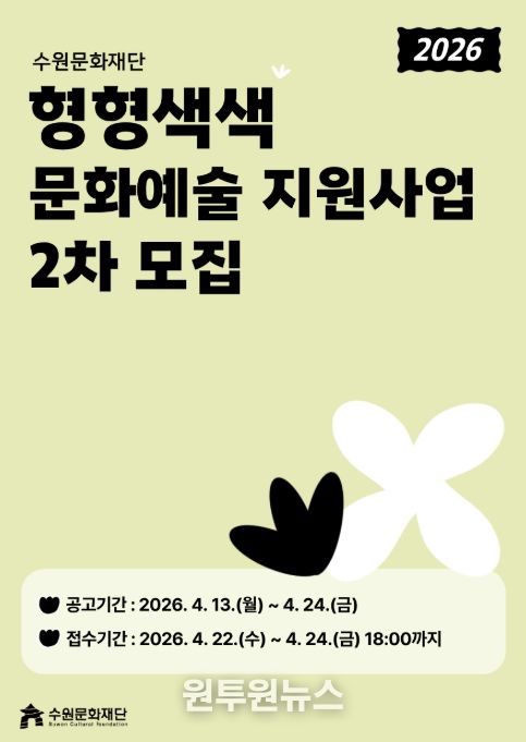 (원투원뉴스) 수원문화재단은 지역 예술인의 창작활동을 지원하고 시민의 문화 향유 기회를 확대하기 위해 이달 13일부터‘형형색색 문화예술지원사업’ 2차 공모를 추진한다.