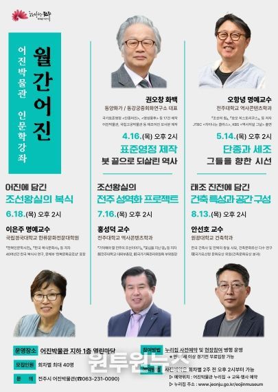 (원투원뉴스) 전주시 어진박물관은 4월부터 오는 8월까지 매월 셋째 주 목요일 인문학 강좌인 ‘월간어진’을 운영한다고 10일 밝혔다.