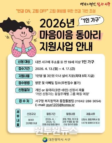 (원투원뉴스) 대전 서구는 1인 가구의 사회적 고립을 예방하고 건강한 사회적 관계망 형성을 지원하기 위한 ‘마음이음 동아리 지원사업’ 참여자를 모집한다.