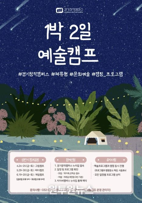 《예술캠프》는 경기창작캠퍼스 인근 숙박시설과 연계해 운영하며, 참여 신청은 경기창작캠퍼스 누리집을 통해 가능하다. 가족 단위 선착순으로 모집하며, 자세한 내용은 누리집에서 확인할 수 있다.