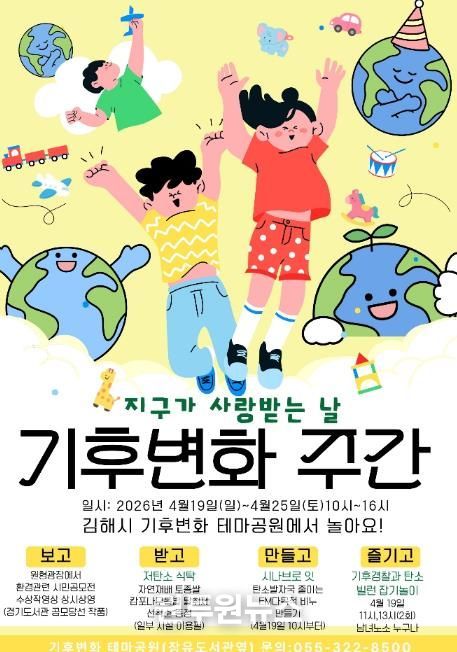 (원투원뉴스) 김해시는 지구의 날(4.22)을 기념한 제18회 기후변화주간(4.20~24)을 맞아 시민들이 탄소중립을 쉽고 재미있게 체험할 수 있도록 김해탄소중립체험관과 기후변화테마공원에서 다양한 특별행사를 운영한다고 10일 밝혔다.
