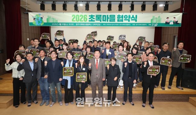 (원투원뉴스) 청주시는 10일 청주국제에코콤플렉스 강당에서 청주국제에코콤플렉스, 초록마을사업추진위원회와 함께 ‘2026년 초록마을 협약식’을 개최하고 시민 주도의 탄소중립 실천 확산에 나섰다.