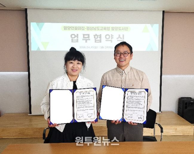 (원투원뉴스) 경상남도교육청 함양도서관(관장 김혜진)과 함양연꽃의집(원장 김재성)은 4월 10일 지역 내 취약계층을 위한 독서문화 활성화 및 교육공동체 형성을 목적으로 업무협약(MOU)을 체결했다.