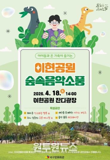 (원투원뉴스) 서구문화회관은 아이들과 온 가족이 다채로운 공연을 마음껏 누릴 수 있는‘이현공원 숲속음악소풍’을 개최한다. 14일부터 16일까지 서구 어린이집 및 유치원을 대상으로 단체 관람 프로그램을 진행하고, 18일에는 가족 대상 프로그램을 선보인다.