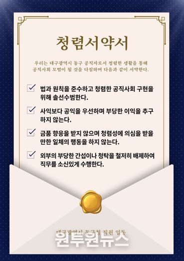 (원투원뉴스) 대구 동구청은 청렴 문화 확산과 공직기강 확립을 위해 청렴한 생활을 통해 모범이 될 것을 다짐하는 ‘청렴서약서’를 제작해 구청 부서 및 동행정복지센터 출입구에 부착했다.