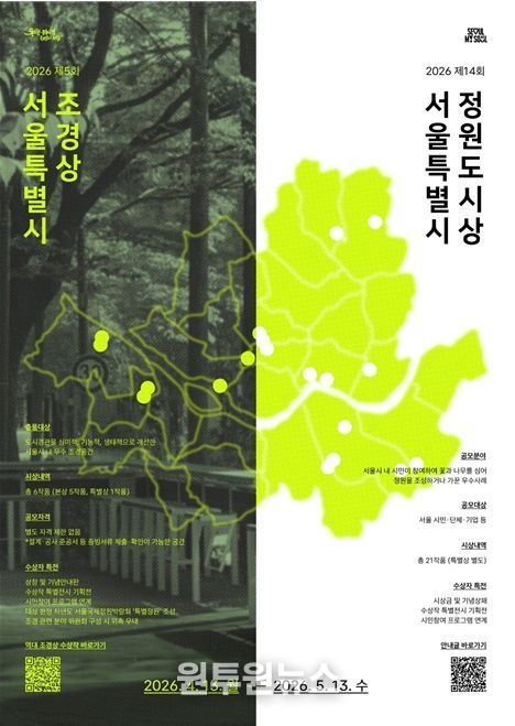 (원투원뉴스) 서울시는 도시경관 개선에 기여한 우수 조경공간과 시민참여 정원 사례를 발굴·확산하기 위해 '2026 서울특별시 조경상·정원도시상' 공모를 4월 13일부터 5월 13일까지 진행한다고 밝혔다.