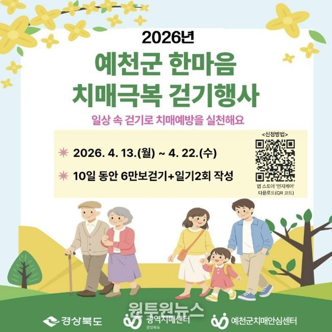 (원투원뉴스) 예천군은 오는 13일부터 22일까지 치매 예방에 효과적인 걷기 실천을 장려하고 지역 주민의 건강한 생활 습관 형성을 위해'2026년 한마음 치매극복 걷기 행사'를 비대면 방식으로 운영한다.