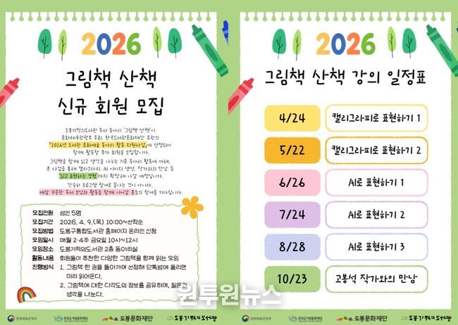 (원투원뉴스) 서울 도봉구 도봉기적의도서관이 독서동아리 ‘그림책 산책’을 확대 운영한다. ‘그림책 산책’은 그림책을 함께 읽고 이야기를 나누는 성인 독서 동아리다. 앞서 도서관은 문화체육관광부와 한국도서관문화재단이 추진하는 녪년 도서관 문화예술 동아리 활동 지원사업’에 선정됐다.