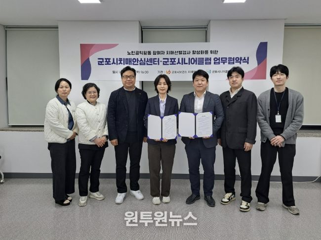 (원투원뉴스) 군포시치매안심센터는 4월 9일 군포시시니어클럽과 업무협약을 체결하고 노인공익활동 참여자를 대상으로 한 치매선별검사 확대에 나선다고 밝혔다.