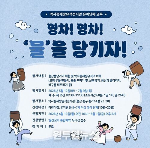 (원투원뉴스) 울산 약사동제방유적전시관이 관내 어린이집과 유치원 원아를 대상으로 울산의 고유 수리민속을 체험하는 '영차! 영차! 물을 당기자!' 교육 프로그램을 운영한다.