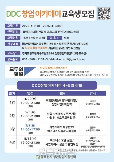 (원투원뉴스) 동두천시 청년창업지원센터는 지역 청년들의 창업 역량 강화와 성공적인 창업 지원을 위해 4월 9일부터 4월 28일까지 ‘DDC 창업아카데미’ 교육생을 모집한다.