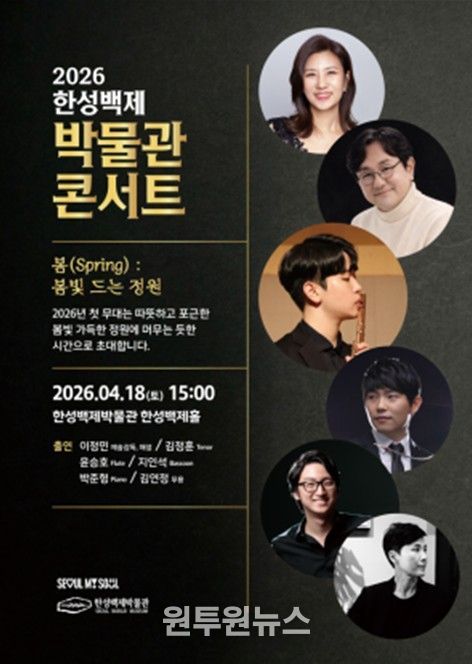 첫 공연은 4월 18일 오후 3시, 한성백제박물관 지하 2층 한성백제홀에서 열린다. ‘봄빛 드는 정원’을 주제로, 따뜻한 봄의 정취를 음악과 무용으로 풀어낼 예정이다. 공연은 봄꽃이 피어나는 움직임을 표현한 무용으로 시작해, 플루트의 맑은 선율과 바순의 깊이 있는 음색, 테너의 청량한 목소리가 어우러져 봄의 생동감을 전하는 무대로 꾸려진다.