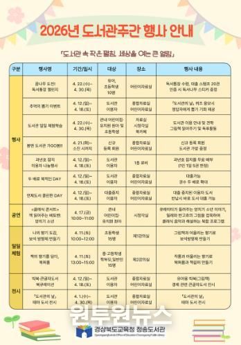 (원투원뉴스) 경상북도교육청 청송도서관이 2026년 4월 도서관주간을 맞이하여 ‘도서관 속 작은 펼침, 세상을 여는 큰 열림’을 주제로 다양한 독서·문화 프로그램을 운영한다.