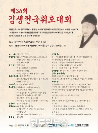 전국의 서예가를 대상으로 오는 5월 2일 유네스코국제무예센터 다목적홀에서 개최되는 이번 대회는 4월 17일까지 참가자를 접수한다. 대회 부문은 한글, 한문, 문인화 등 3개 부문으로 운영되며, 작품 명제는 충주문화원 누리집에서 확인할 수 있다.