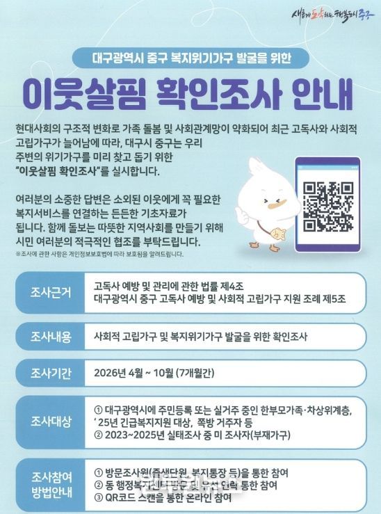 (원투원뉴스) 대구 중구는 고독·고립 예방을 위해 ‘이웃살핌 확인조사’를 실시한다.