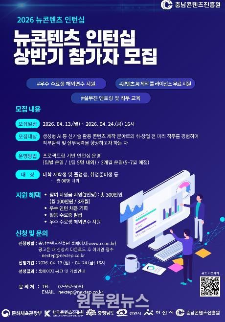 (원투원뉴스) 충남콘텐츠진흥원은 도내 콘텐츠 산업 인재 양성과 일자리 창출을 위해 ‘2026 뉴콘텐츠 인턴십’ 상반기 참가자를 모집한다고 밝혔다.