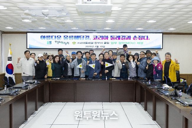 이번 협약은 대한민국 외곽을 잇는 초장거리 걷기 여행길인 ‘코리아둘레길(해파랑길, 남파랑길, 서해랑길, DMZ 평화의 길 4,500km)’을 완보한 회원 30여 명이 참석한 가운데 진행됐으며, 울릉도 도보 여행과 울릉 해담길 및 독도 탐방 활성화를 위해 마련됐다.