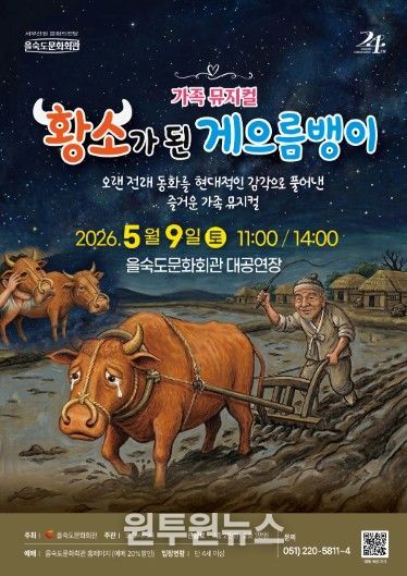 (원투원뉴스) 가정의 달을 맞아 온 가족이 함께 즐길 수 있는 창작 가족 뮤지컬 ‘황소가 된 게으름뱅이’가 을숙도문화회관 대공연장에서 5월 9일 오전 11시와 오후 2시, 두 차례 무대에 오른다.