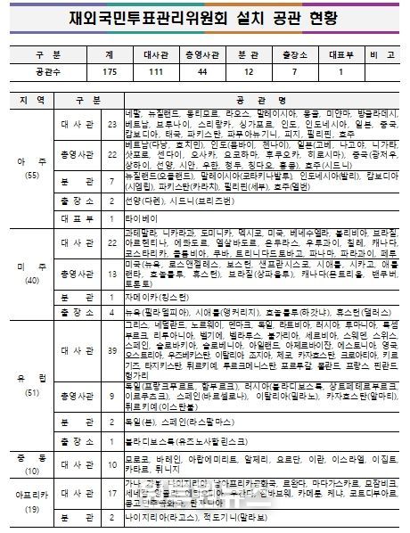 전쟁․폭동 등으로 인해 주재국 정세가 불안한 ▲주아프가니스탄이슬람공화국대사관 ▲주우크라이나대사관 ▲주레바논공화국대사관 ▲주리비아대사관 ▲주사우디아라비아왕국대사관 ▲주젯다총영사관 ▲주두바이총영사관 ▲주예멘공화국대사관 ▲주오만왕국대사관 ▲주이라크공화국대사관 ▲주이라크공화국아르빌분관 ▲주쿠웨이트국대사관 ▲주수단공화국대사관 등 13개 공관에는 재외국민투표관리위원회를 설치하지 않는다.
