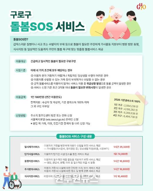 (원투원뉴스) 구로구는 긴급 돌봄이 필요한 주민에게 맞춤형 서비스를 신속히 제공하는 ‘돌봄SOS 서비스’를 운영하고 있다.