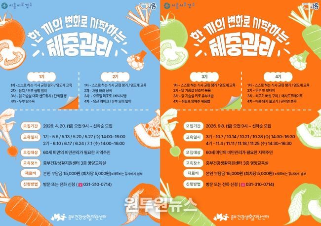 (원투원뉴스) 시흥시보건소 중부건강생활지원센터는 지역주민의 올바른 식생활 실천을 유도하고 건강한 체중 관리 및 비만 예방을 위해 영양·조리 교육 프로그램 ‘한 끼의 변화로 시작하는 체중관리’를 센터 영양교육실에서 운영한다.