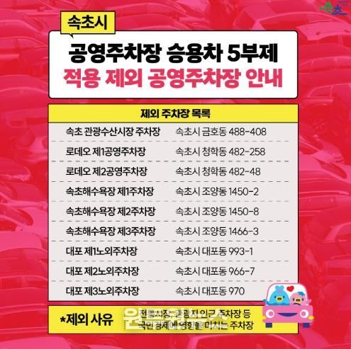 이에 시는 전통시장 및 관광지 인접 주차장인 △속초관광수산시장 주차장 △로데오 1·2 주차장 △속초해수욕장 1·2·3 주차장 △대포 1·2·3 노외주차장 등 총 9개소의 관내 유료 공영주차장에 대해 5부제를 적용하지 않는다.