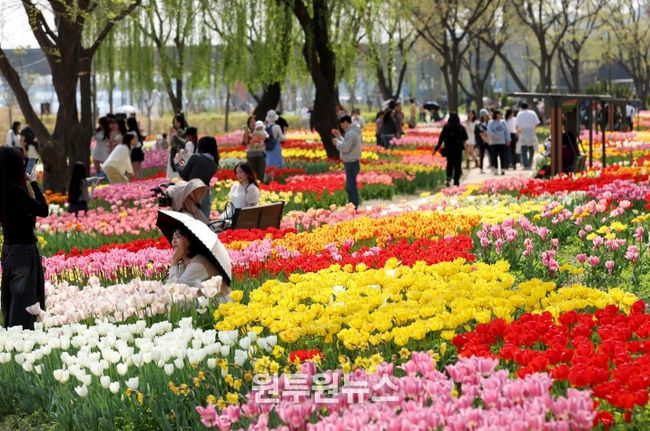 지난해 11월 성동구가 2.2km에 이르는 중랑천 산책로(용비교~살곶이) 구간에 식재한 튤립과 수선화 등 20종 약 15만 구의 구근이 추운 겨울을 이겨내고 3월 말부터 형형색색의 꽃을 피우기 시작했다.