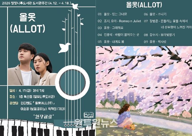 (원투원뉴스) 홍천군 별빛 나루 도서관은 2026년 도서관 주간(4.12.~4.18.)을 맞아 2인조 인디밴드 '올옷(ALLOT)'의 음악 공연을 선보인다.