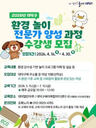 (원투원뉴스) 대덕구는 지역 내 환경교육 활성화와 여성 일자리 창출을 위해 ‘환경 놀이 전문가 양성과정’을 운영하고 참여자를 모집한다.