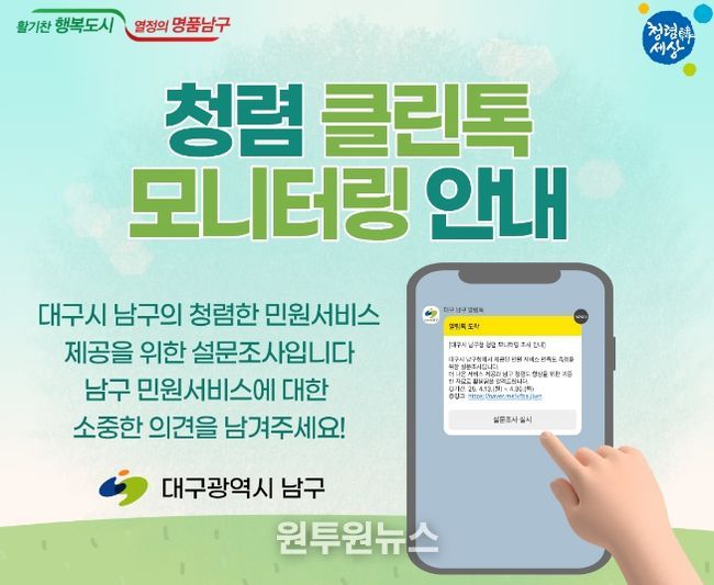 (원투원뉴스) 대구 남구는 행정의 투명성을 강화하고 부패 취약 분야의 실효성 있는 업무 개선을 위해 외부 민원인을 대상으로 한 ‘청렴 클린톡 모니터링’을 본격적으로 운영한다고 밝혔다.