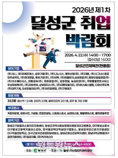 (원투원뉴스) 달성군은 지역 경제 활성화와 고용난 해소를 위해 오는 4월 22일 오후 2시부터 달성군민체육관에서 ‘2026 제1차 달성군 취업박람회’를 개최한다.