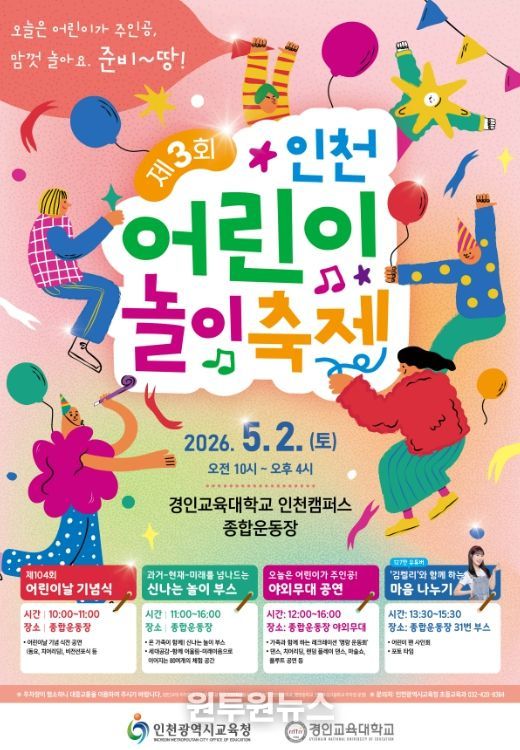 (원투원뉴스) 인천광역시교육청은 5월 2일 경인교육대학교 인천캠퍼스에서 유·초등학생과 가족이 함께하는 ‘제3회 인천 어린이 놀이 축제’를 개최한다.