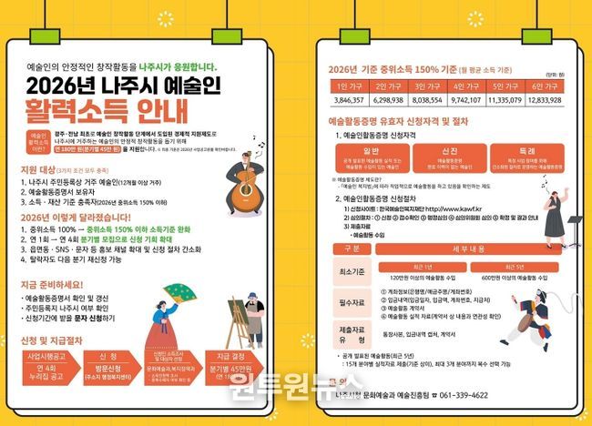 (원투원뉴스) 전남 나주시가 지속 가능한 문화예술 생태계 조성을 위해 ‘2026년 2분기 예술인 활력소득 지원금’ 신청을 오는 5월 19일까지 접수한다.