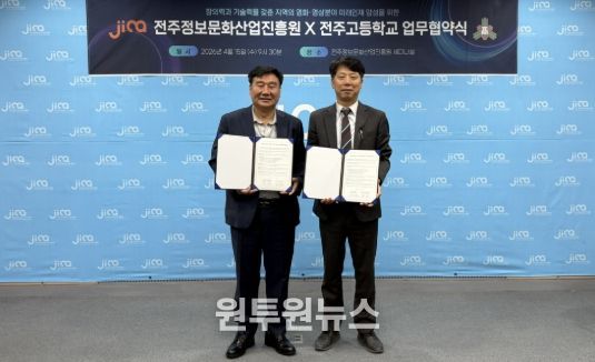 (원투원뉴스) 전주정보문화산업진흥원은 15일 진흥원 1층 세미나실에서 전주고등학교와 ‘콘텐츠 창의 인재 양성을 위한 업무 협력 협약’을 체결했다.
