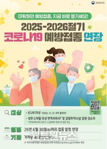 (원투원뉴스) 이천시보건소는 질병관리청 지침에 따라 2026년 여름철 코로나19 유행에 대비하고자 ‘2025-2026절기 코로나19 예방접종’ 기간을 기존 4월 30일에서 6월 30일까지 연장한다고 밝혔다.