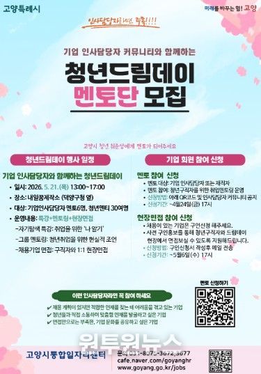 (원투원뉴스) 고양특례시는 청년들의 취업 경쟁력 강화를 위한 프로그램 ‘청년드림데이’개최를 앞두고, 기업 인사담당자를 대상으로 한 일자리 멘토단을 모집한다.