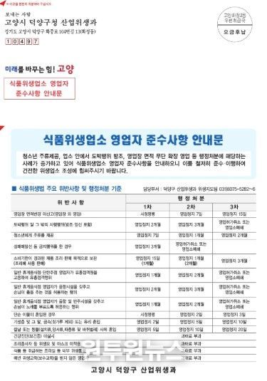 덕양구 관계자는 “이번 안내문 배부를 통해 식품위생법 주요 위반사항과 변경된 규정을 적극 안내하고, 영업자의 위생관리 역량을 높이고자 한다”며 “기온 상승으로 식중독 발생 위험이 높아지는 시기인 만큼 예방 수칙 홍보를 병행해 안전한 식품위생 환경 조성에 최선을 다하겠다”고 밝혔다.