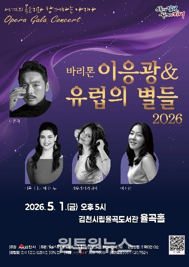(원투원뉴스) 김천시 문화예술회관은 오는 5월 1일 오후 5시 율곡도서관 율곡홀에서 오페라 갈라 콘서트 '바리톤 이응광 & 유럽의 별들 2026'를 개최한다.